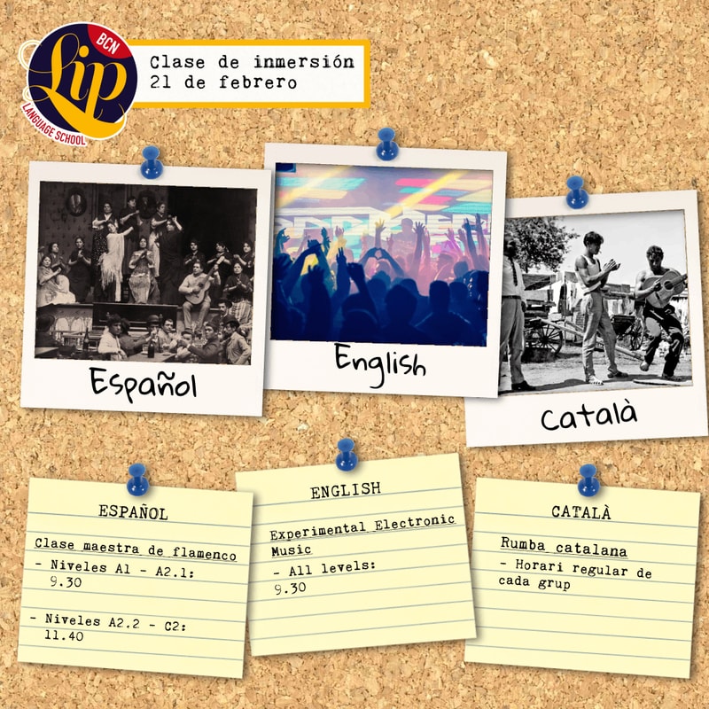 This Friday we’ll have immersion class on 3 languages: Spanish, English and Catalan. Here you can check out the theme for each class and the schedule for the different groups and levels.